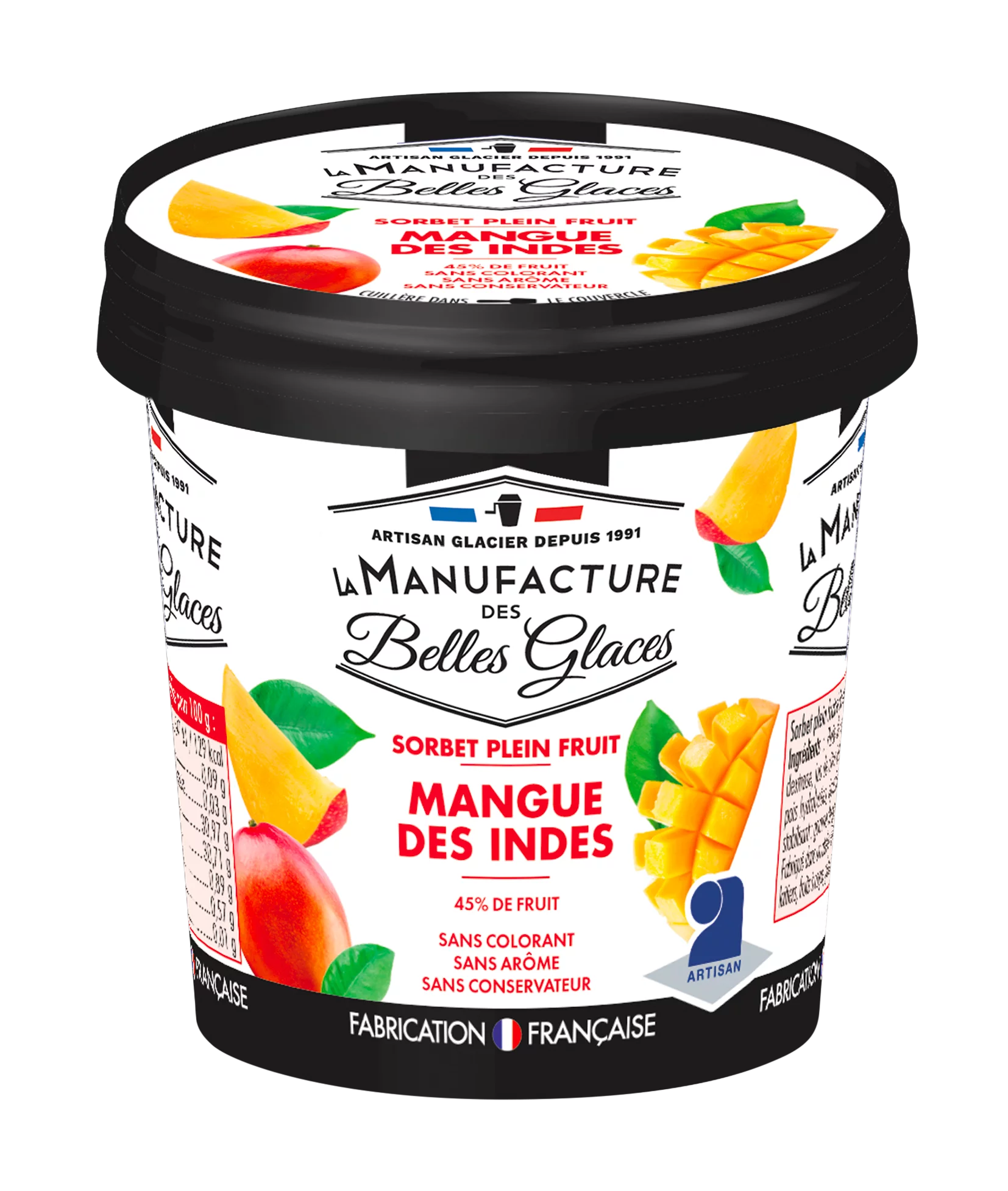 Ingrédients : Purée de mangue 45%, eau, sucre, dextrose, épaississant : gomme de xanthane, stabilisants : pectine et gomme de guar, jus de citron.